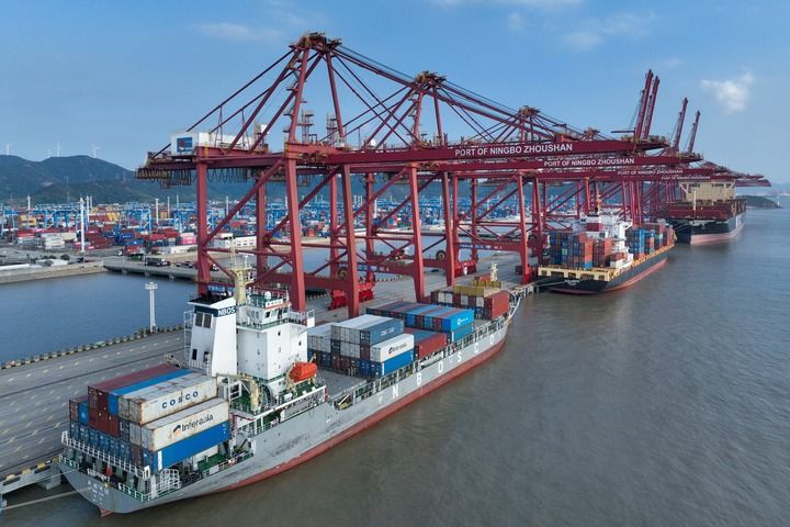 2025年10月13日,在寧波舟山港金塘港區(qū)大浦口集裝箱碼頭,船舶進(jìn)行集裝箱裝卸作業(yè)(無(wú)人機(jī)照片)。新華社發(fā)(鄒訓(xùn)永攝)