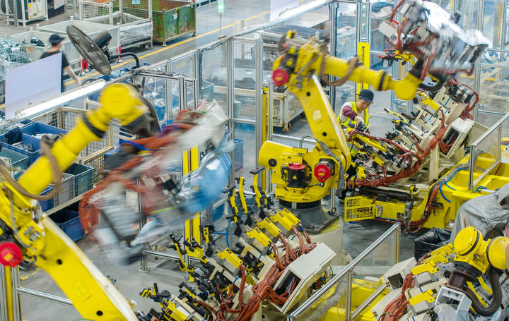 2025年10月9日,浙江省湖州市長(zhǎng)興經(jīng)濟(jì)技術(shù)開(kāi)發(fā)區(qū)的長(zhǎng)興地通汽車部件有限公司技術(shù)人員操控工業(yè)機(jī)器人生產(chǎn)新能源汽車配件(無(wú)人機(jī)照片)。新華社發(fā)(譚云俸攝)