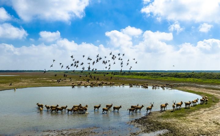 2025年10月11日,在江蘇東臺(tái)條子泥濕地,候鳥(niǎo)飛翔,成群野生麋鹿悠閑散步,一派人與自然和諧共生的生態(tài)美景(無(wú)人機(jī)照片)。新華社發(fā)(孫家錄攝)